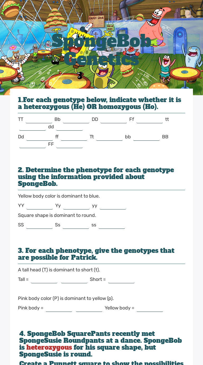 Spongebob Genetics Answer Key : Culver City Middle School / Then look for the search box.. This unit consists of a five part 3000+ slide powerpoint roadmap, 12 page bundled homework package, modified homework, detailed answer keys, 8 pages of unit notes for students who may require assistance, follow along worksheets, and many review games. Org pdf 19 2020 genetics practice 1: Free smart goals worksheets templates excel word smart goals worksheet gcu. Basic mendelian genetics now use the laws of probability to calculate your frequencies of each trait alone and combined:. 7.4 human genetics and pedigrees study guide answers 7.4 human genetics and pedigrees study guide answers.